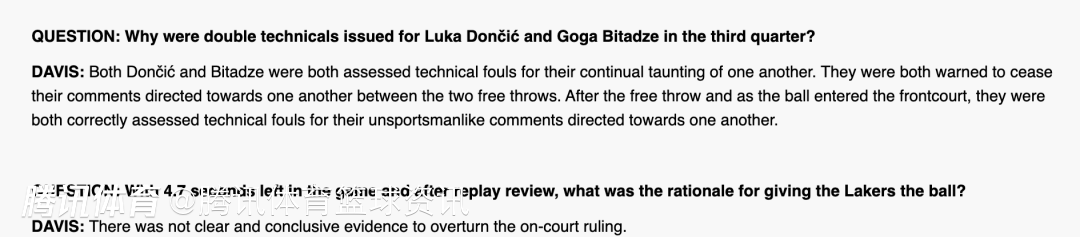 裁判主管戴维斯:东契奇和比塔泽二人因持续互相挑衅、言语不逊,均被吹罚技术犯规。在两次罚球之间,裁判已对双方提出警告,要求停止互相言语攻击。罚球结束、球进入前场后,两人仍继续发表非体育道德言论,因此被正确吹罚技术犯规。