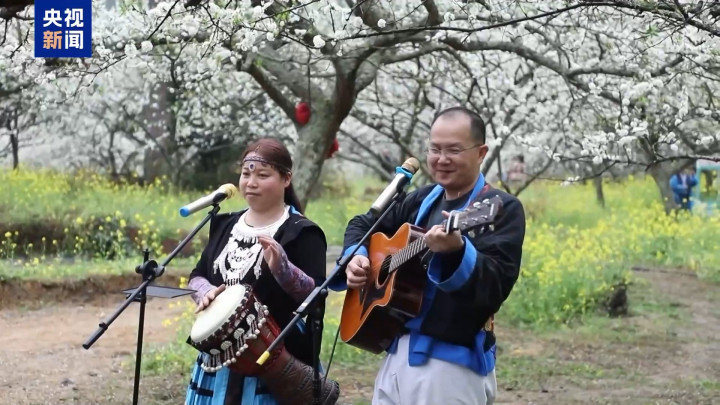 近日,广西河池南丹县城关镇的千亩李花迎来盛花期,洁白花朵铺展山野,与点缀其间的桃花、油菜花相映成趣。